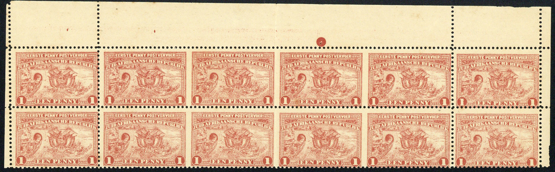1895 Penny Postage 1d. red block of twelve (6x2), being the top two rows of a pane, the centre three rows variety imperforate between, unmounted mint; vertical fold at centre and a couple of fox marks. A scarce multiple. S.G. 215cb, unpriced