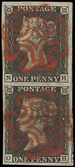 NH-OH, vertical pair, each with a complete and practically upright red Maltese Cross cancellation, large margins all round and showing portions of two adjoining stamps at right; very fine and most attractive. Photo