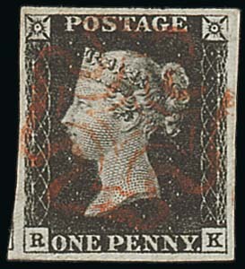 RK, complete and upright red Maltese Cross cancellation, large margins all round and showing a portion of the adjoining stamp at lower left; very fine and most appealing. Photo