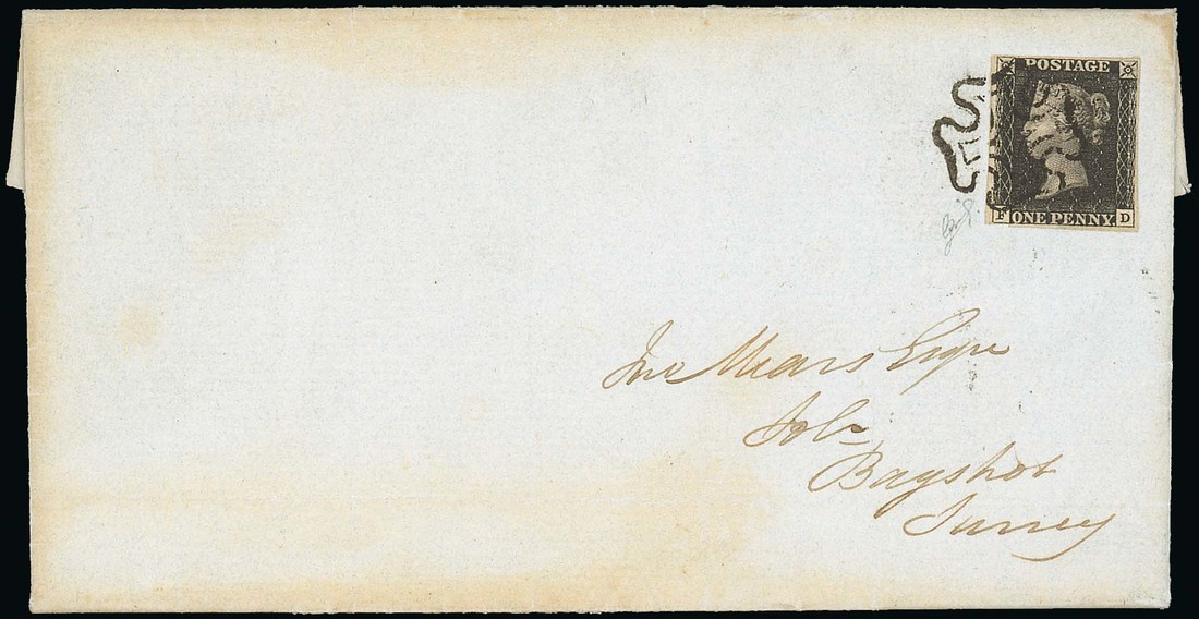 FD close but clear at at lower left, good to large margins other sides, tied by crisp black Maltese Cross cancellation, on entire letter, dated 3 April 1841, from Oldham to Bagshot; light traces of staining, fine. R.P.S. Certificate (2014). Photo