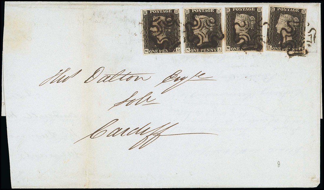 LK (?), MD, MI (double letter M) and NA, four singles, all with margins all round, tied by black Maltese Cross cancellations to large part of entire letter, dated 22 Feb. 1841 to Cardiff, red Swansea d.s. on reverse; filing fold affecting NA, otherwise fine and a scarce franking. Photo