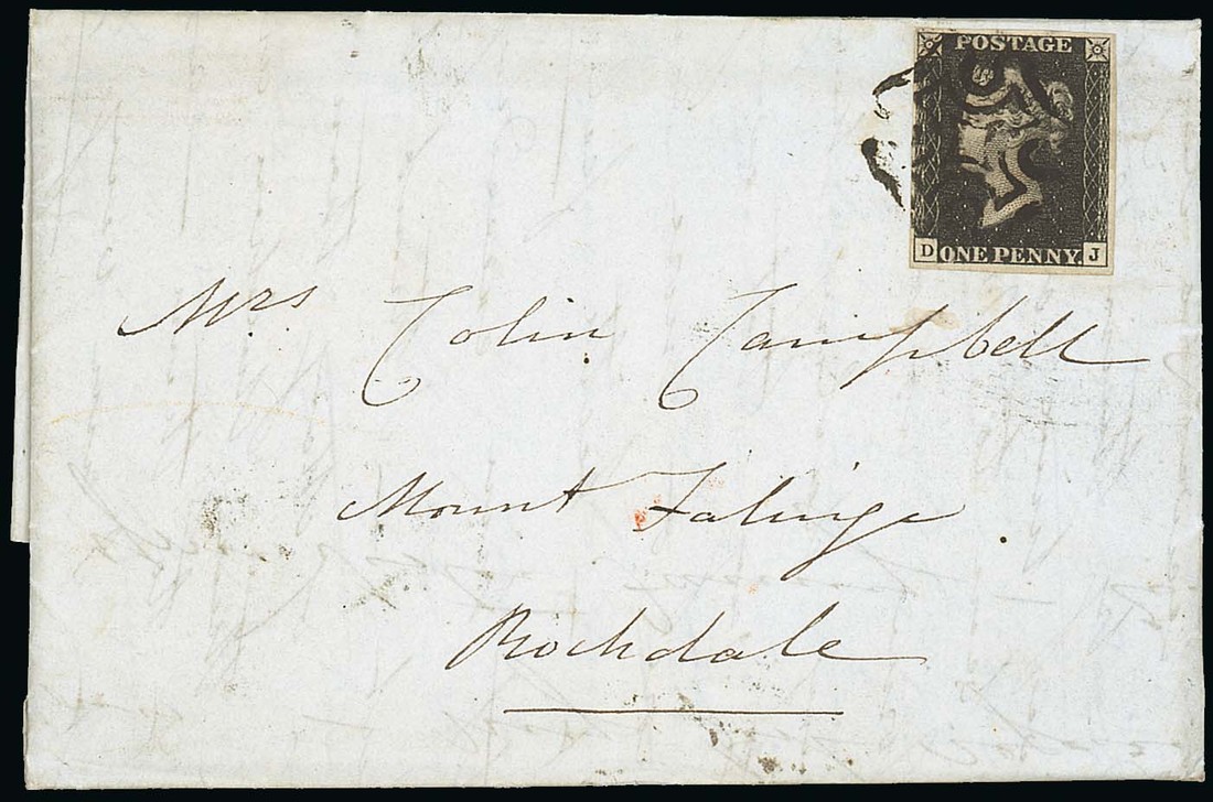 DJ, good to large margins all round, tied by black Maltese Cross cancellation to entire letter (with additional enclosure), dated 8 May 1841, to Rochdale, on reverse boxed Tarbert datestamp, endorsed Received unsealed at P.O. Tarbert and with large part of red wax "tarbert/(crown)" seal; fine and most unusual. Photo