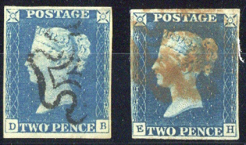 DB good to large margins all round, black Maltese Cross cancellation; diagonal crease and tiny thins, also EH close to good margins, cancelled by red Maltese Cross; fair to good
