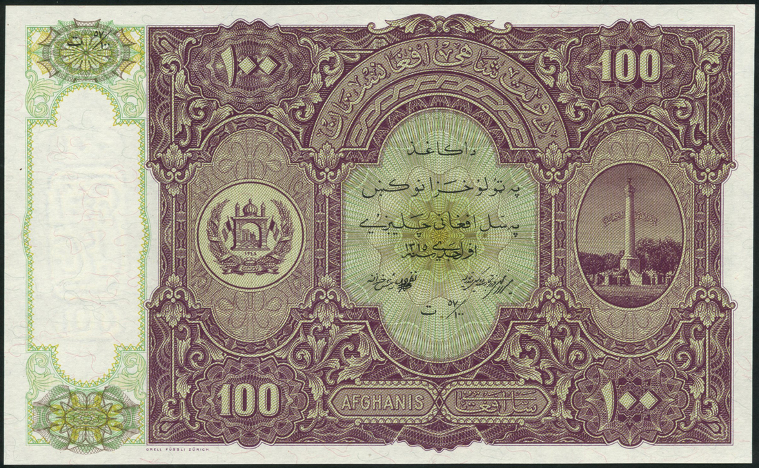 Ministry of Finance, Afghanistan, 100 afghanis, 1936, purple and green, coat of arms, Minar-I-Istiqlal (Independence Monument) in Kabul, reverse guilloche patterns