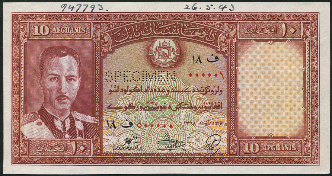 (†) Da Afghanistan Bank, printer's archival specimen 10 Afghanis (5), SH 1318 (1939), all different serial number runs, red-brown on multicoloured underprint, King Muhammad Zahir at left, arms at upper centre, reverse Darul Aman Palace, Kabul, perforated SPECIMEN