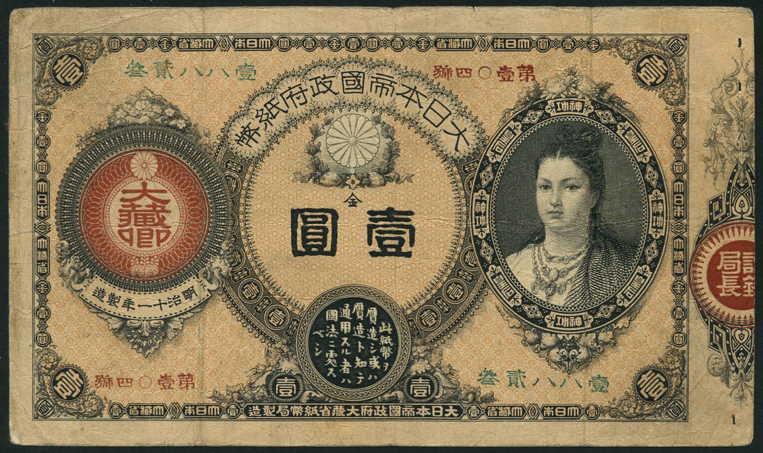 (x) Great Imperial Japanese Government note, 1 yen, ND (1878-1881), pale pink-brown and black, the Empress Jingu at right, reverse pale blue, red seal top right