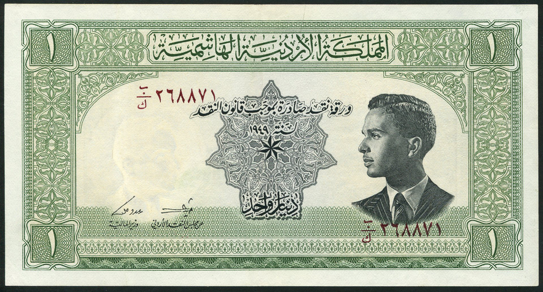 (x) Hashemite Kingdom of Jordan, 1 dinar, 1949, serial number B/K 268871, black and green, King Hussein at right, value at each corner, reverse green, Forum columns at Jerash