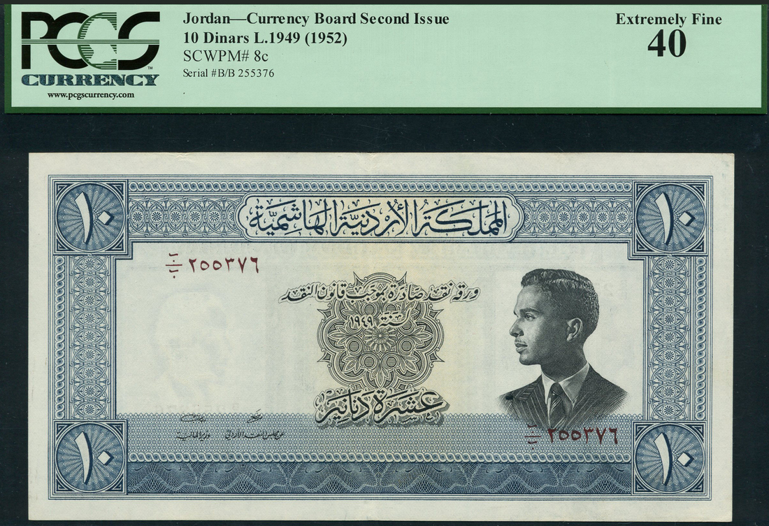 (x) Hashemite Kingdom of Jordan, 10 dinars, L.1949 (1952), serial number B/B 255376, black and blue, King Hussein at right, value at each corner, reverse blue, Petra at centre