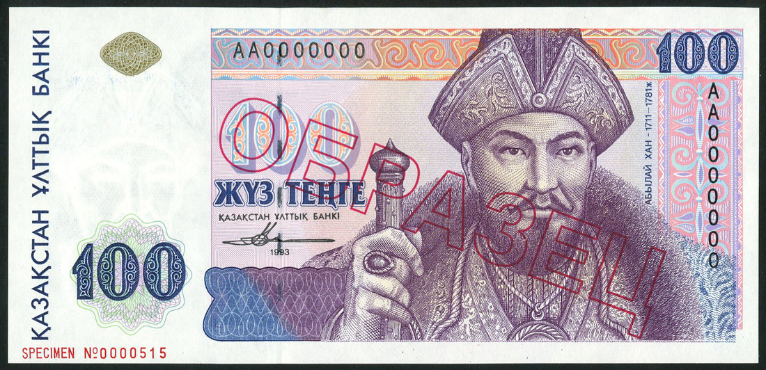 (x) Kazakhstan National Bank, a group of specimens of the 1993 series comprising 1 Tenge, blue and multicoloured, Al-Farabi at right; 3 Tenge, green and multicoloured, Suinbai at right; 5 Tenge, brown and multicoloured, Kurmangazy at right; 100 Tenge, purple and multicoloured, Ablai Khan at right, all overprinted SPECIMEN in red on obverse and reverse