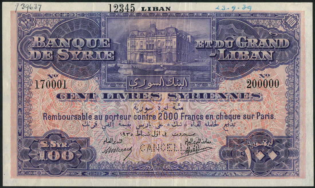 (†) Banque de Syrie et du Grand-Liban, printer's archival specimen 100 Livres, 1 January 1935, serial number run 170001 to 200000, purple and multicoloured, LIBAN in text top centre, bank building at upper centre, value at centre and in each corner, Berard and Laferriere signatures, reverse brown, purple, orange and blue-green, vignette of town and mountains at centre, value in ornate guilloches at left and right and at lower centre, perforated CANCELLED