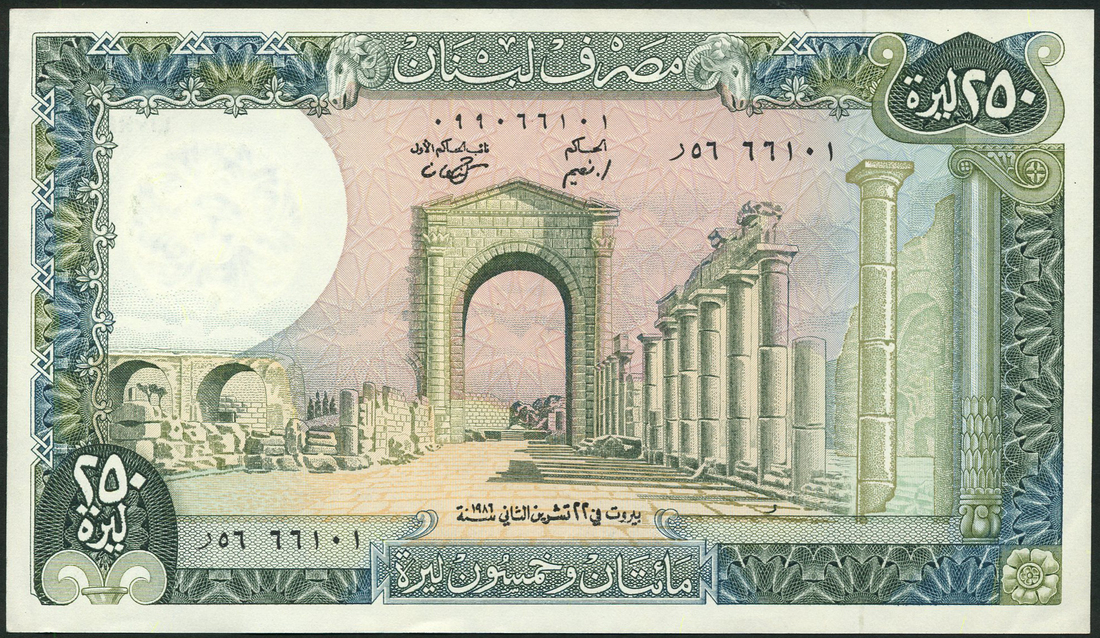 Bank of Lebanon, consecutive set of 25 livres, 1983, serial numbers 89101-89200, 50 livres, 1985 serial numbers 69301-69400, 100 livres, 1985, serial numbers 80220-80300, 250 livres, serial numbers 66101-66200