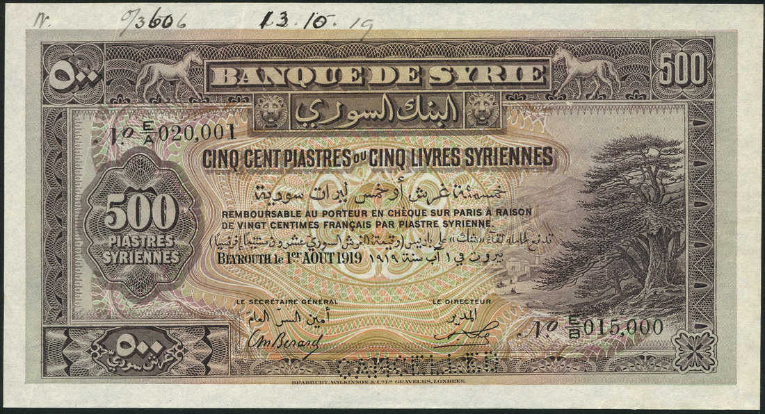 (†) Banque de Syrie, printer's archival specimen 500 Piastres, Beyrouth, 1 August 1919, serial number run E/A 020,001 to E/B015,000 brown-purple and multicoloured, value in guilloche at left, cedar tree at right, reverse deep grey-green, brown and yellow, view of Beirut harbour at centre, value at left and right, perforated CANCELLED