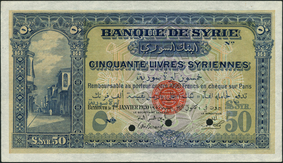 (†) Banque de Syrie, specimen 50 Livres, 1 January 1920, no serial numbers, blue on olive-green and multicoloured underprint, street scene in Beirut at left, red Bradbury Wilkinson specimen seal at centre, reverse purple, salmon pink, pale green and lilac, feluccas and coastline in rectangular frame at centre, value at left and right, three punch holes