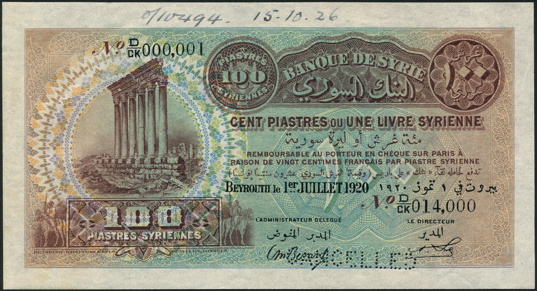 (†) Banque de Syrie, printer's archival specimen 100 Piastres, Beyrouth, 1 July 1920, serial number run D/CK 000,001 to D/CK 014,000, brown, blue-green and multicoloured, the Pillars of Baalbek at left, reverse purple, blue-green and yellow-green, cityscape at centre set in ornate pillars, value in each corner, perforated CANCELLED