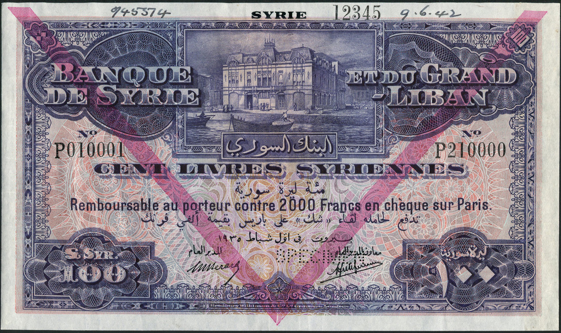 (†) Banque de Syrie et du Grand-Liban, Syria, printer's archival specimen 100 Livres, 1 February 1935, serial number run P010001 to P210000, purple and multicoloured, Bank of Beyrouth at upper centre, reverse brown, blue, orange and pink, vignette of town, river and mountains, lilac chevron overprint Type C, perforated SPECIMEN