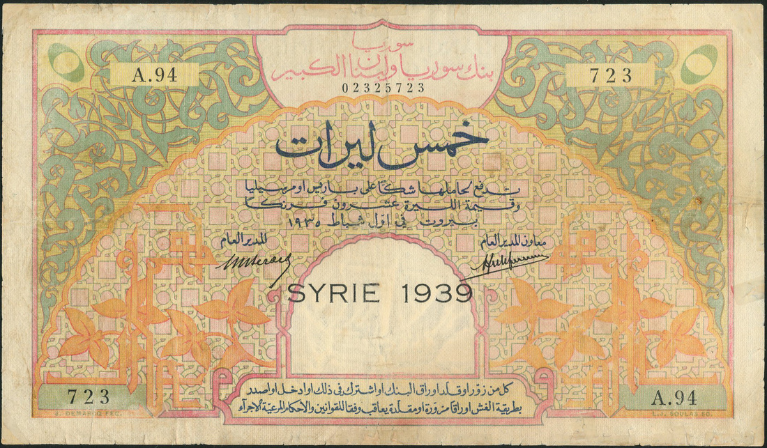 Banque de Syrie et du Grand-Liban, Syria, 5 Livres, 1935, serial number A.94 723, Berard and Laferriere signatures, blue-green, pink and orange on yellow underprint, ornate scrollwork at upper left and right, stylised flowers at lower left and right, overprinted SYRIE 1939 below central Arabic text, reverse Azem Palace in rectangular frame at centre