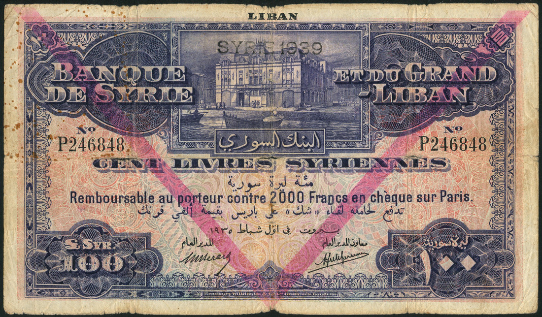 Banque de Syrie et du Grand-Liban, Syria, 100 Livres, 1935, serial number P246848, Berard and Laferriere signatures, violet and multicoloured, Bank head office at top centre, value in guilloches in each corner, LIBAN in top margin, overprinted SYRIE 1939, reverse purple and blue-green, view of Aleppo, chevron lilac overprint Type C on obverse and reverse