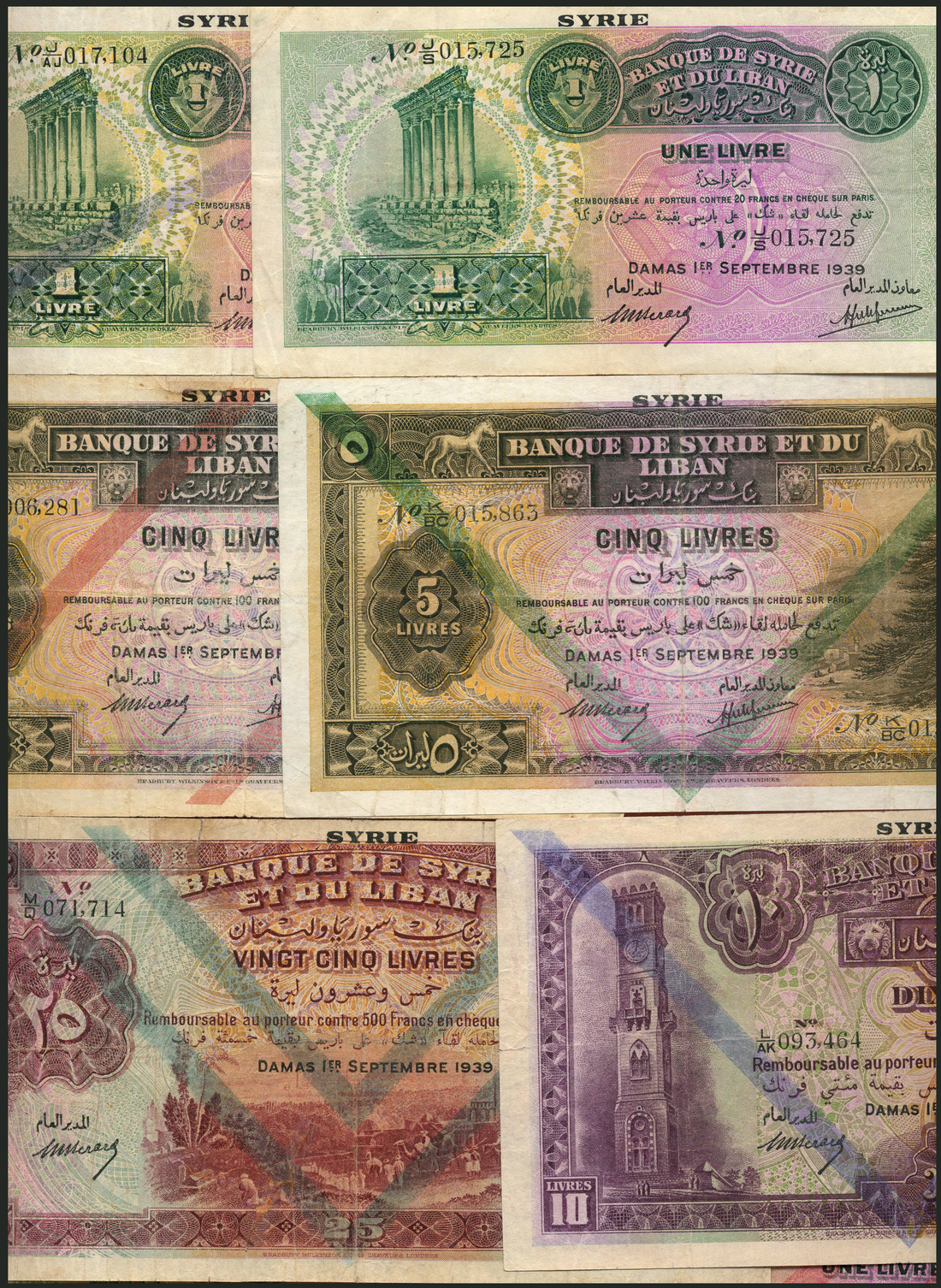 Banque de Syrie et du Liban, 1 livre (5), 5 livres (5), 10 livres (3), 25 livres (5), all 1939 issue, all with different overprints, including without overprint for the 1, 10 and 25 livres