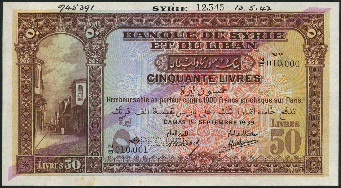 (†) Banque de Syrie et du Liban, Syria, printer's archival specimen 50 Livres, 1 September 1939, serial number run N/B 010,001 to N/F 10,000, brown on multicoloured underprint, Beirut street scene at left, SYRIE in black overprint top centre, lilac coloured Type A overprint, reverse blue, lilac and orange, feluccas and coastline, value at left and right, perforated SPECIMEN