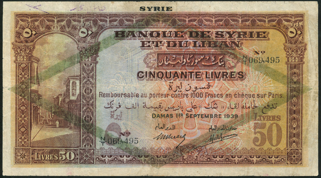Banque de Syrie et du Liban, Syria, 50 Livres, 1 September 1939, serial number N/T 069,495, Berard and Laferriere signatures, brown, pale blue and multicoloured, street scene at left, reverse blue, rectangular vignette of two dhows and mountains, value in ornate guilloches at left and right, SYRIE in top margin, green diamond overprint Type E on obverse and reverse