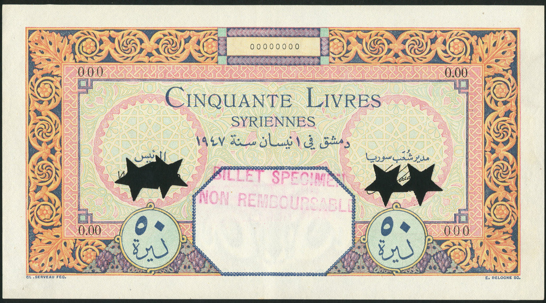 Banque de Syrie et du Liban, Syria, specimen 50 Livres, 1947, zero serial numbers, Busson and Souayal signatures, orange, blackish green and pink on pale green and yellow underprint, scrollwork borders, geometric pattern set in rectangular frame at centre, value at lower left and right, reverse domed house at centre, value in each corner, overprinted BILLET SPECIMEN NON REMBOURSABLE in purple on obverse and reverse, stars cancellation