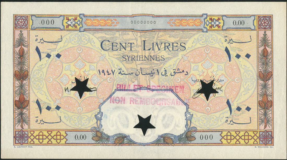 Banque de Syrie et du Liban, Syria, specimen 100 Livres, 1947, zero serial numbers, Busson and Souayal signatures, blue, pink, yellow and multicoloured, cedar tree at centre, ornate patterned circles on each side, cedar cones in left and right panels, reverse mosque at upper centre, incense burners at left and right, overprinted BILLET SPECIMEN NON REMBOURSABLE in purple on obverse and reverse, stars cancellation