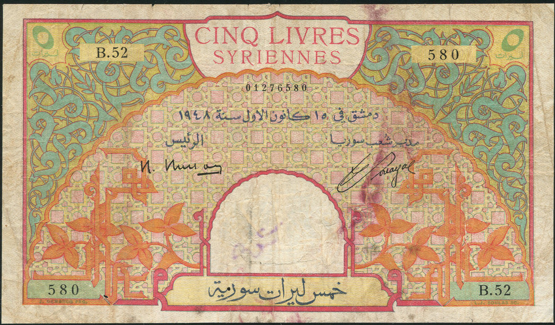 Banque de Syrie et du Liban, 5 Livres, 1948, zero serial number B.52 580, Busson and Souayal signatures, blue-green, pink and orange on yellow underprint, ornate scrollwork at upper left and right, stylised flowers at lower left and right, reverse Azem Palace in rectangular frame at centre