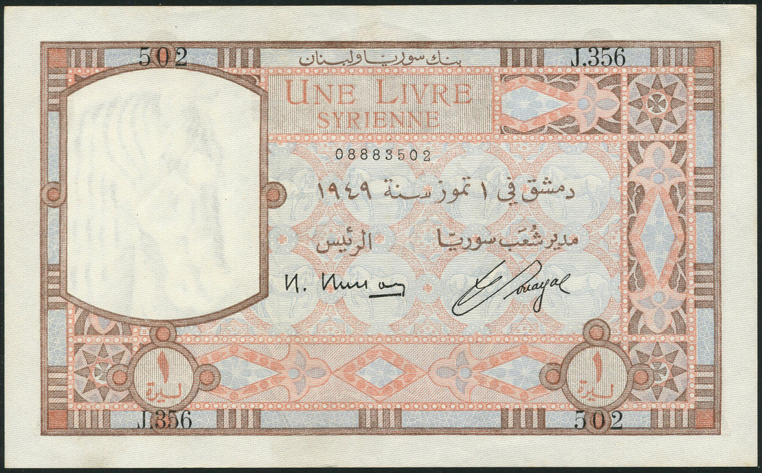 (x) Republic of Syria, 1 livre, 1949, serial number J.356502, Blue, brown and orange, reverse harbour and mountain landscape