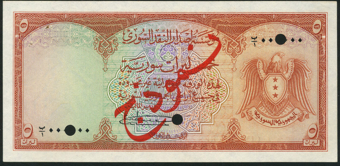 Institut d'Emission de Syrie, Syria, specimen 5 Livres, ND (1950s), serial number B/1 000000, red-brown on multicoloured, coat of arms at right, value in each corner, reverse Citadel of Aleppo, overprinted SPECIMEN in red in Arabic on obverse and in English on reverse, three punch holes