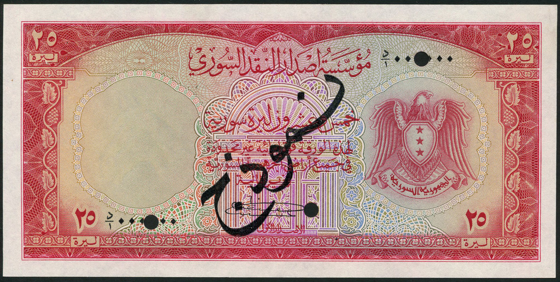 Institut d'Emission de Syrie, Syria, specimen 25 Livres, ND (1950s), serial number D/1 000000, carmine-red on multicoloured, coat of arms at right, value in each corner, reverse ruins of Palmyra, overprinted SPECIMEN in black in Arabic on obverse and in English on reverse, three punch holes