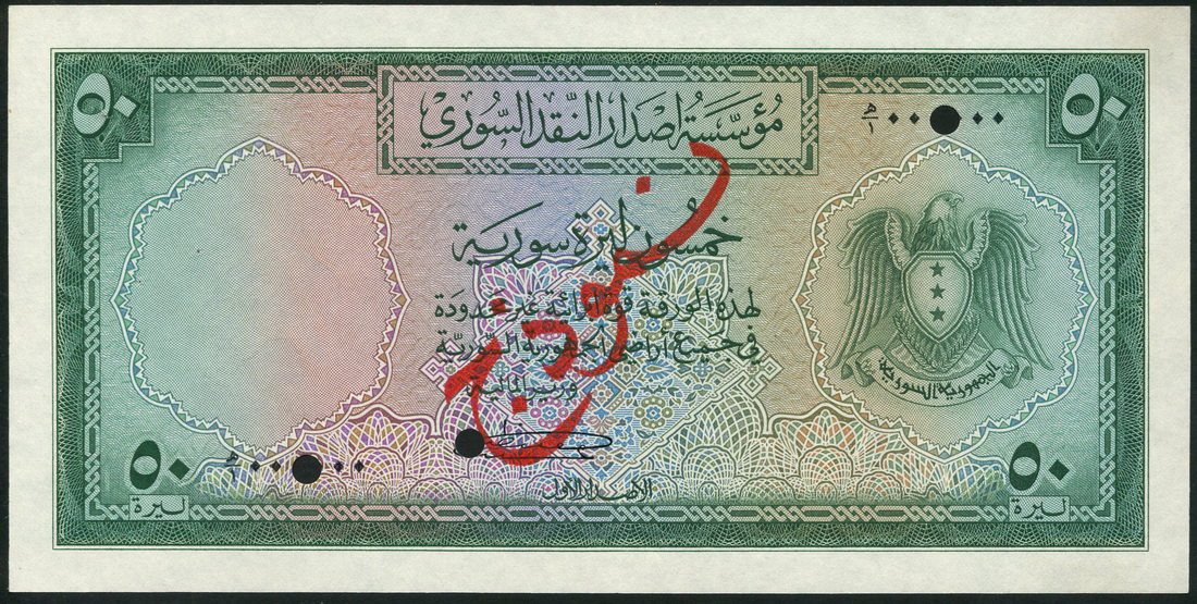 Institut d'Emission de Syrie, Syria, specimen 50 Livres, ND (1950s), serial number D/1 000000, carmine-red on multicoloured, coat of arms at right, value in each corner, reverse arches and trees in courtyard of Azm Palace, overprinted SPECIMEN in red in Arabic on obverse and in English on reverse, three punch holes