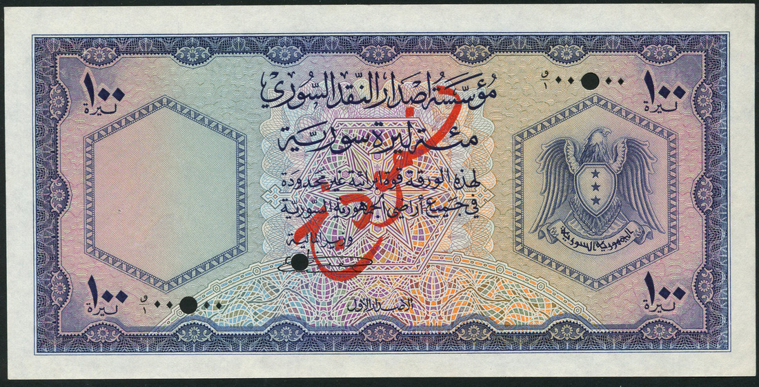 Institut d'Emission de Syrie, Syria, specimen 100 Livres, ND (1950s), serial number F/1 000000, dark blue on multicoloured, coat of arms at right, value in each corner, reverse Norias of Hama on the Orontes River, overprinted SPECIMEN in red in Arabic on obverse and in English on reverse, three punch holes