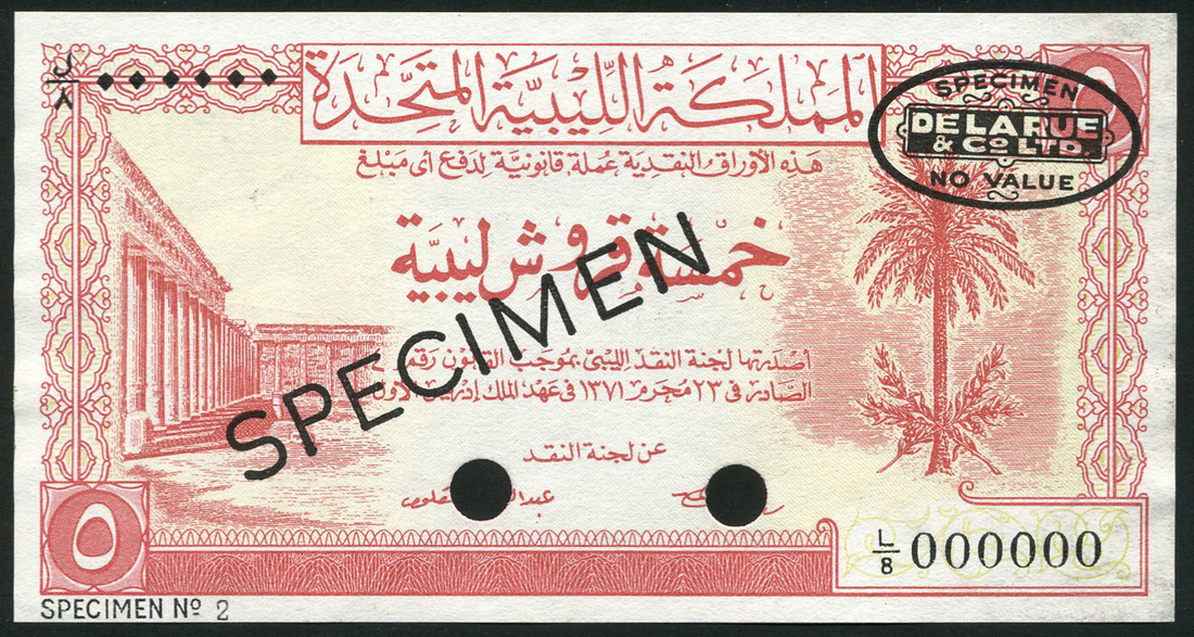 (†) United Kingdom of Libya, specimen 5 Piastres (4), 24 October 1951, prefixes L/1, L/2, L/8, L/10, red on pale yellow and pale green underprint, Roman Forum at Cyrene at left, palm tree and olive branches at right, reverse value set in guilloches, SPECIMEN No. 24 in black, No 1 in black, No 2 in black and No 2 in red in lower left margin respectively, all overprinted SPECIMEN in black (the first three) and red (the fourth) with two De La Rue specimen ovals on obverse and reverse