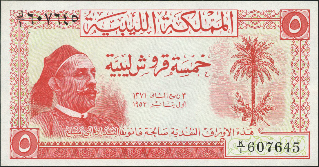 Kingdom of Libya, 5 piastres, 1 January 1952, serial number K/1 607645, red on pale yellow and green underprint, King Idris at left, palm and olive branches at right, reverse, denomination at each corner and at centre, ornate pattern