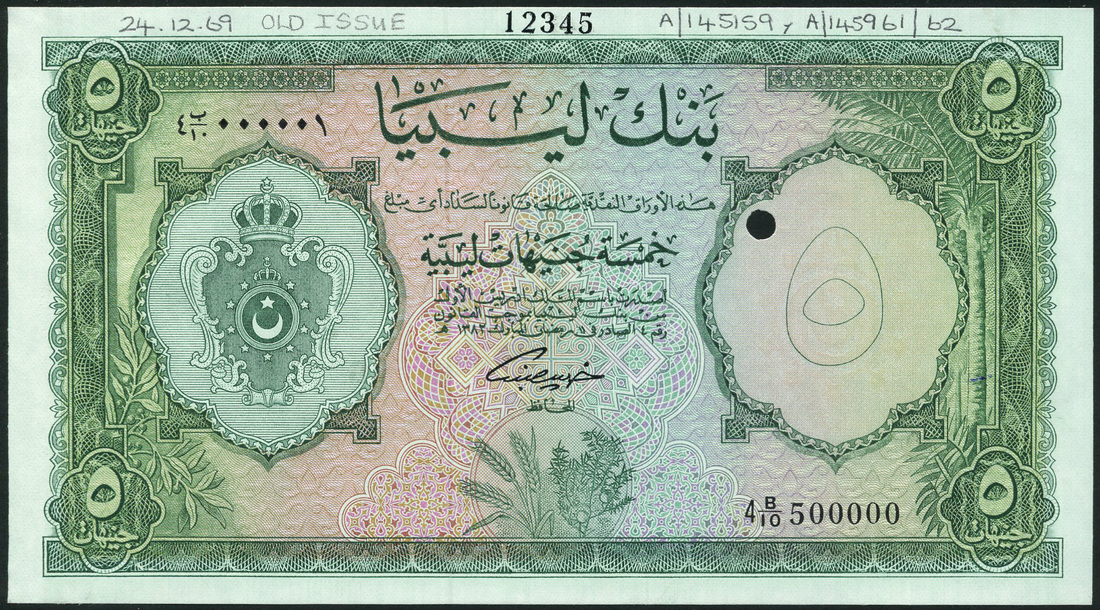 (†) Bank of Libya, specimen 5 Pounds (2), Law of 1963/AH1382, serial numbers 4B/10 500000 and 4B/11 500000, green on multicoloured underprint, crowned arms at left, value in each corner, reverse ornate stylised floral patterns in geometric shapes, value in guilloche at centre
