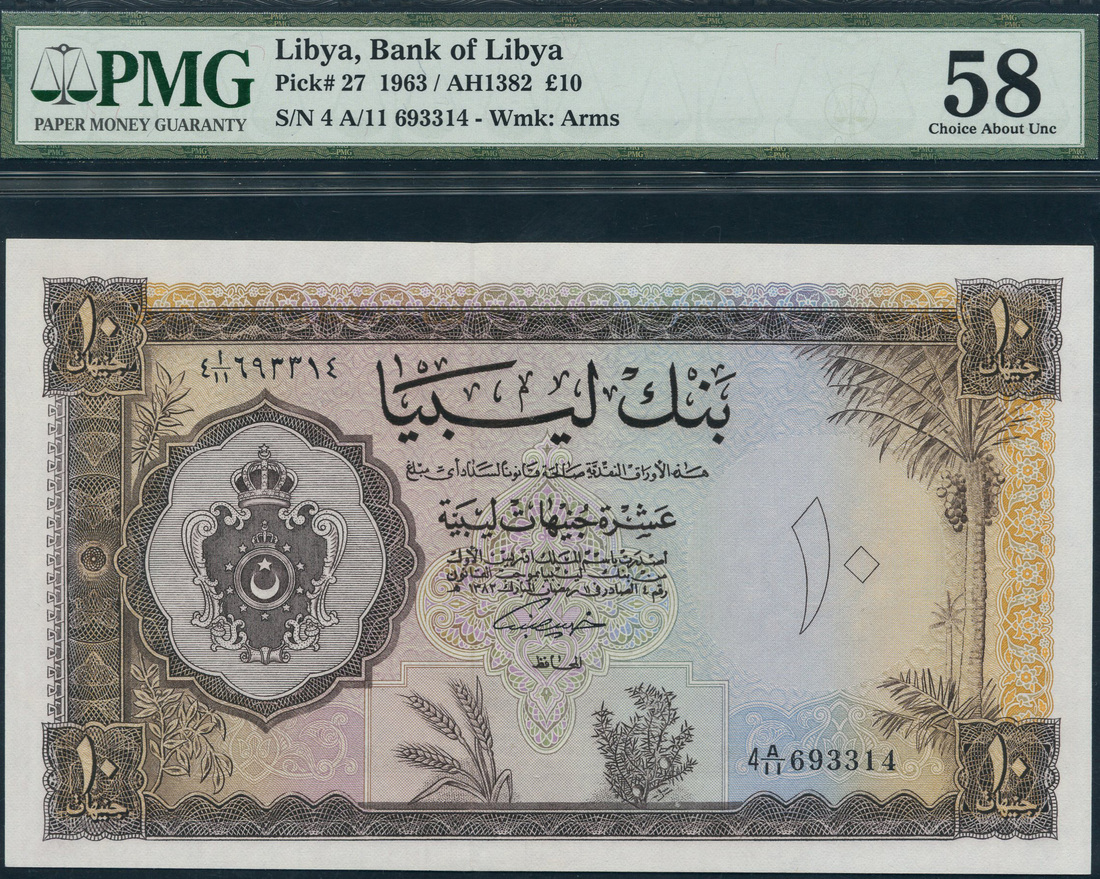 Bank of Libya, 10 pounds, 1963, serial number 4 A/11 693314, brown on multicolour underprint, arms at left, value at right and each corner, reverse, bank title top centre, value at centre and in corners