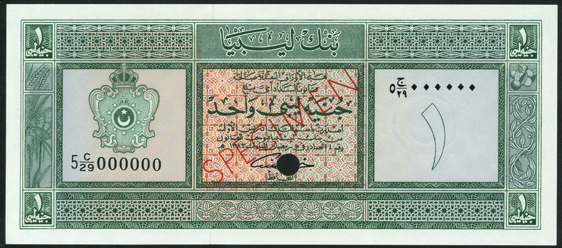 (†) Bank of Libya, a group of the Law of 5 February 1963, Second Issue, all arms at left, reverse ornate patterns and guilloches, comprising specimen proof ¼ Pound, serial number 4F/1 000000, red; specimen colour trial ¼ Pound, serial number 4F/13 000000, blue; specimen colour trial ½ Pound, serial number 5D/15 000000, red; and specimen colour trial 1 Pound, serial number 5C/29 000000, green, the last four all overprinted SPECIMEN in red on obverse and reverse, one punch hole