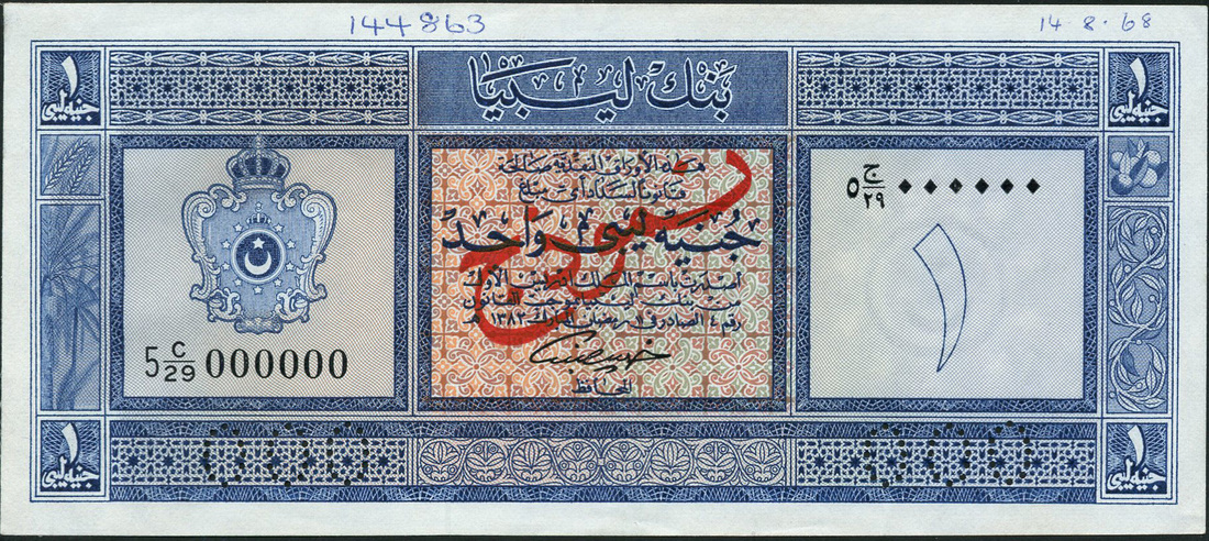 (†) Bank of Libya, specimen 1 Pound, Law of 1963/AH1382, serial number 5C/29 000000, blue on multicoloured underprint, crowned arms at left, value in each corner, reverse ornate stylised floral patterns in geometric shapes, value in words at centre, overprinted SPECIMEN in Arabic in red on obverse and SPECIMEN in red in English on reverse, perforated 000000