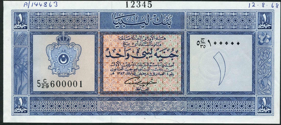 (†) Bank of Libya, printer's archival specimen 1 Pound, Law of 1963/AH1382, serial number run 5C/29 600001 to 5C/35 100000, blue on multicoloured underprint, crowned arms at left, value in each corner, reverse ornate stylised floral patterns in geometric shapes, value in words at centre