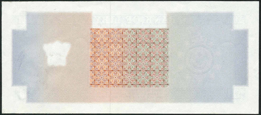 (†) Bank of Libya, printer's progressive proof 1 Pound, Law of 1963/AH1382, no serial numbers, no signatures, obverse with orange, green and multicoloured central pattern and pale blue and orange underprint only, reverse blue ornate stylised floral patterns in geometric shapes, value in words at centre