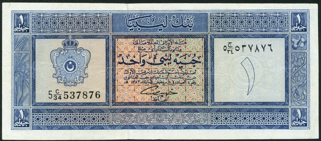 Bank of Libya, 1 pound, 1963, serial number 5 C/34 537876, blue on multicolour underprint, arms at left, value at right and each corner