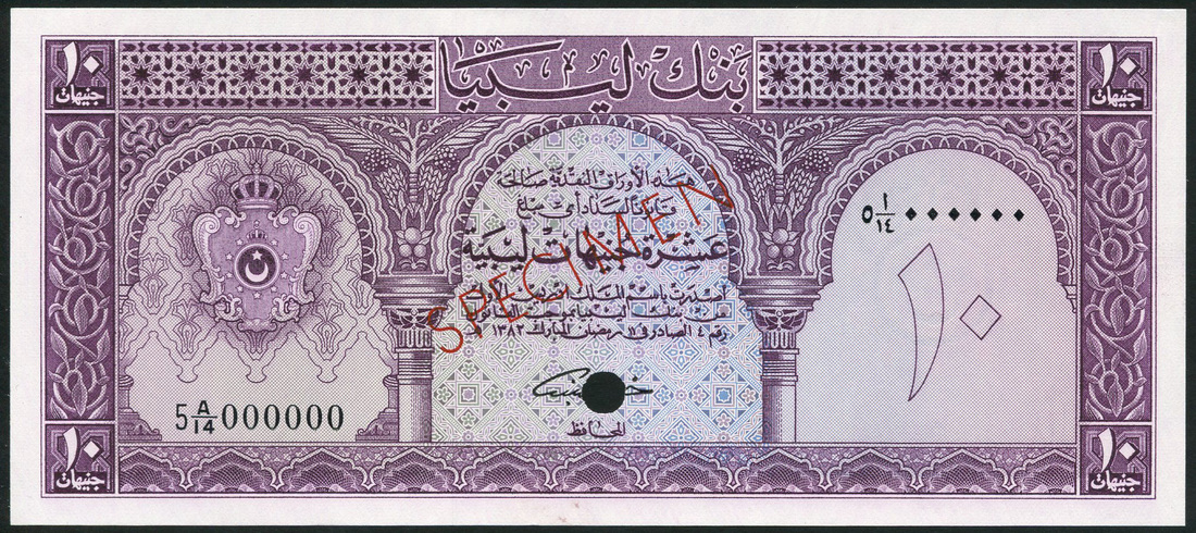 (†) Bank of Libya, a pair of specimen colour trials of the Law of 5 February 1963, Second Issue, both arms at left, reverse ornate patterns and guilloches, comprising 5 Pounds, serial number 5B/13 000000, blue; 10 Pounds, serial number 5A/14 000000, purple, both overprinted SPECIMEN in red on obverse and reverse, one punch hole