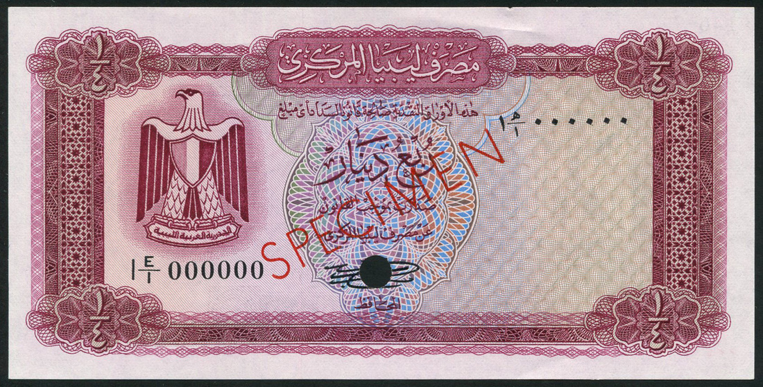 (†) Central Bank of Libya, specimen colour trial ¼ Dinar, ND (1971), serial number 1E/1, purple, without inscription from the Quran at lower right; specimen colour trial ¼ Dinar, ND (1972), serial number 1E/5, purple, with inscription, both coat of arms at left, reverse doorway and ornate guilloches, both overprinted SPECIMEN in red on obverse and reverse, one punch hole