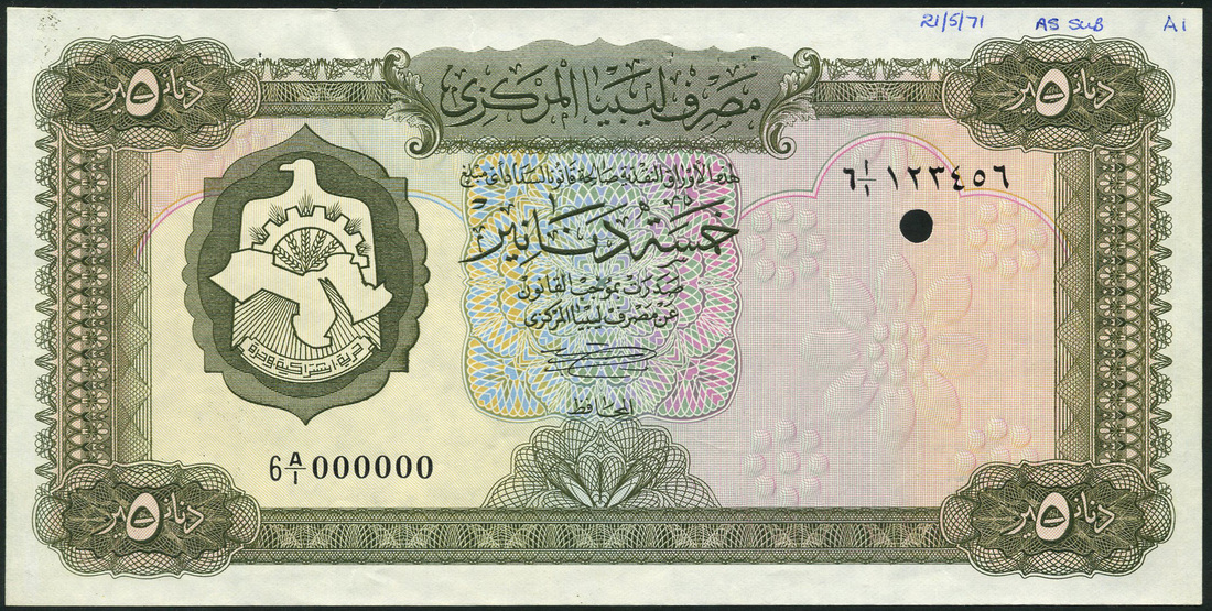 (†) Central Bank of Libya, specimen proof 5 Dinars, ND (1971), serial number 6A/1 000000, deep olive-green, coat of arms at left, without inscription from the Quran at lower right, reverse walled fortress, no watermark, no security thread, one punch hole