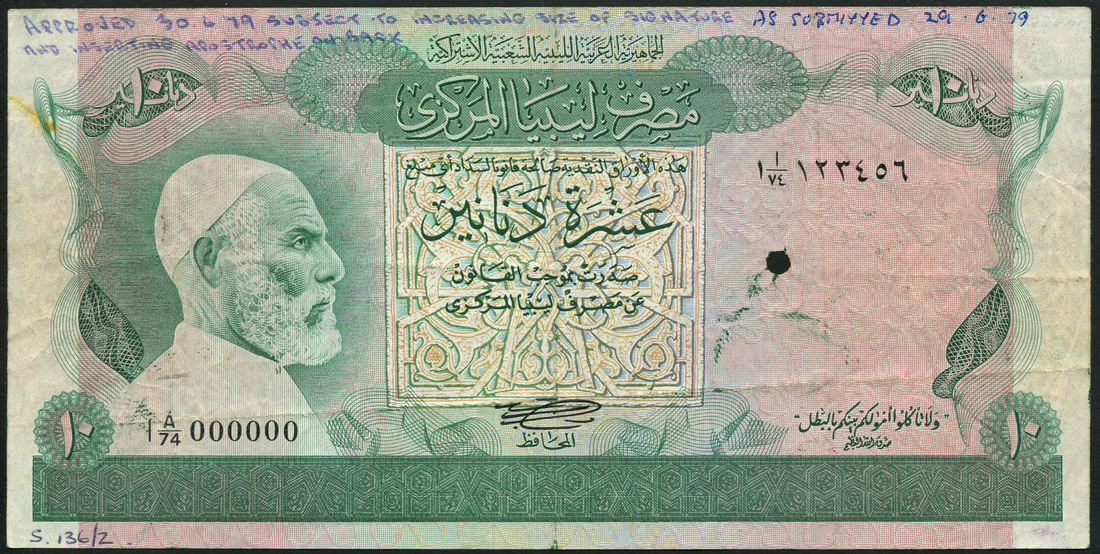 (†) Central Bank of Libya, specimen proof ¼ Dinar, ND (1979), serial number 2E/1 000000, Sherlala signature, green, Leptis Magna arch at left, no security thread, one punch hole; specimen proof ½ Dinar, ND (1979), serial number 2D/1 000000, Sherlala signature, green, petroleum refinery at left, no security thread; specimen proof 10 Dinars, ND (1979), serial number 1A/74 000000, Sherlala signature, Omar El Mukhtar at left, with security thread, one punch hole