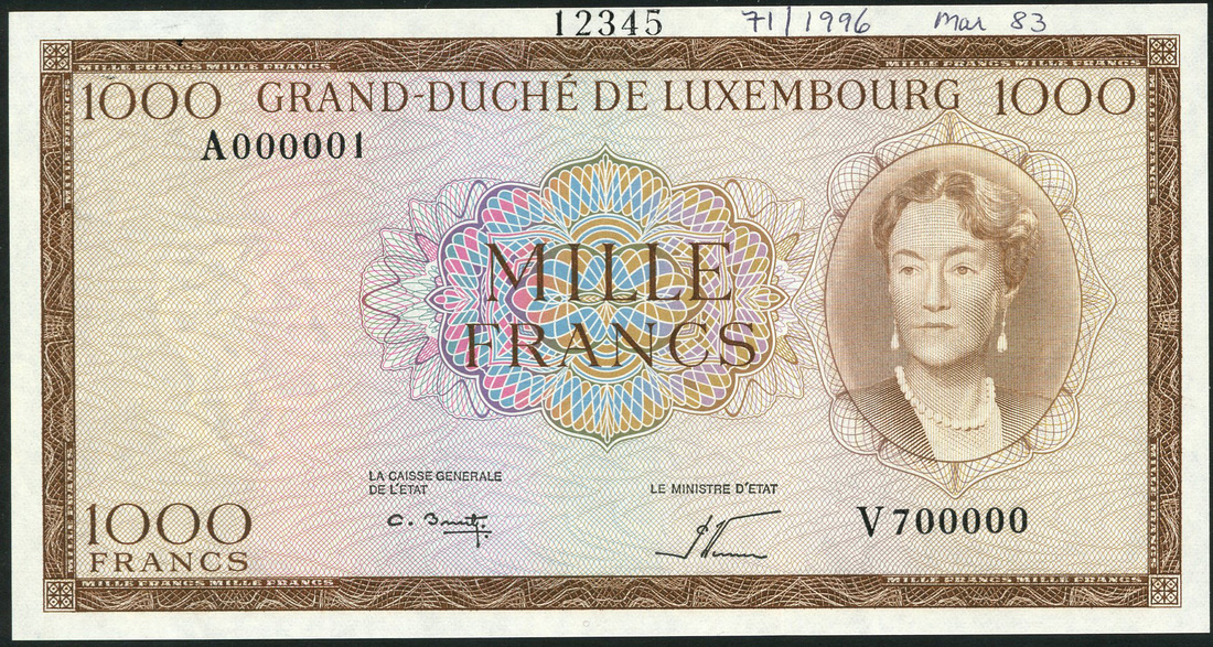 (†) Grand-Duche de Luxembourg, printer's archival specimen 1000 Francs, ND (c1963), serial number run A000001 to V700000, brown on multicoloured underprint, portrait of Grand Duchess Charlotte at right, value in words in guilloche at centre, reverse crowned coat of arms at centre, value in guilloche at left and in each corner