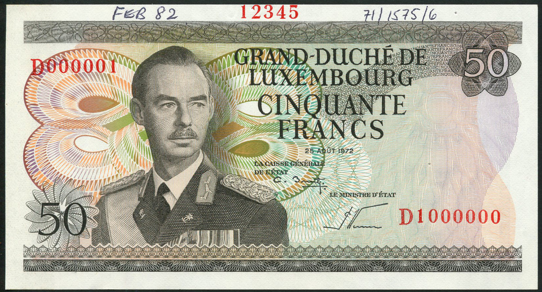 (†) Grand-Duche de Luxembourg, a pair of progressive proofs for 50 Francs, ND (c1972), comprising uniface obverse with guilloche and underprint only; obverse with guilloche and underprint, complete reverse with factory scene; also 50 Francs proof, ND (c1972), no serial numbers, no signatures; and 50 Francs, ND (c 1972), printer's archival specimen, serial number run D000001 to D1000000, both signature titles MINISTER D'ETAT, dark brown on multicoloured underprint, Grand Duke Jean at left, reverse factory scene