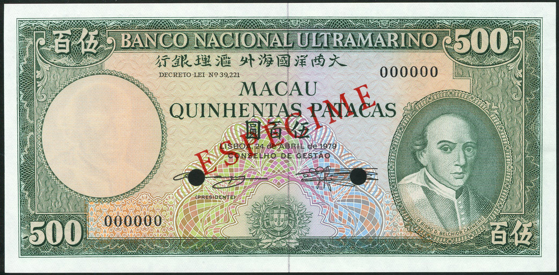 (†) Banco Nacional Ultramarino, Macau, specimen 500 Patacas, 24 April 1979, serial number 000000, green and multicoloured, portrait of Bishop Belchior Carneiro at lower right, arms at lower centre, reverse young woman looking out at ships, overprinted ESPECIME diagonally in red on obverse and reverse, two punch holes