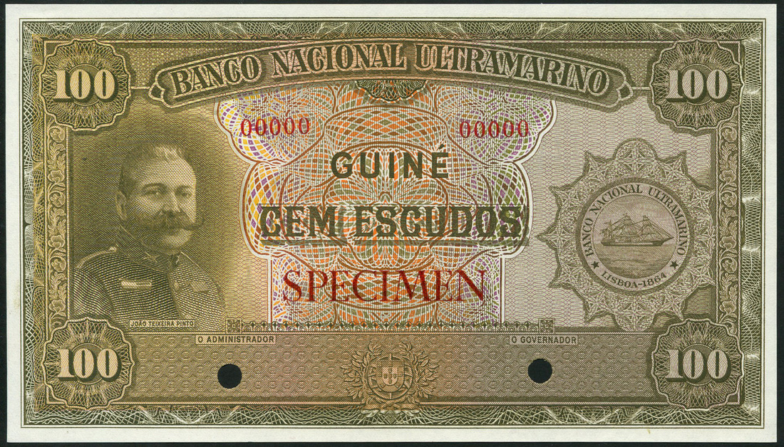 (†) Banco Nacional Ultramarino, Portuguese Guinea, specimen colour trial 50 Escudos, ND (1958), serial number B000000, blue, reverse blue, green and salmon-pink; specimen colour trial 50 Escudos, 30 June 1964, serial number C000000, purple, reverse deep green, pale green and salmon-pink; specimen colour trial 100 Escudos, ND (c 1958), serial number 00000, deep olive-green, reverse dark green, pale green and lilac, all Joao Teixeira Pinto at left, reverse woman looking at ships, all overprinted SPECIMEN in red on obverse and reverse, two punch holes