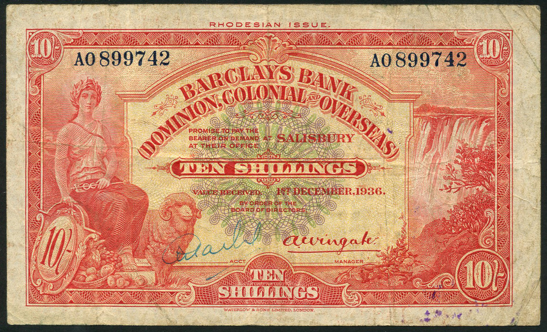 Barclays Bank (D.C.O), Rhodesia Issue, 10 shillings, 1 December 1936, serial number A0899742, red on multicolour underprint, female allegory with ram at left, Victoria Falls at right, value at centre and each corner, reverse red and yellow, lion reclining at low centre, value at each corner